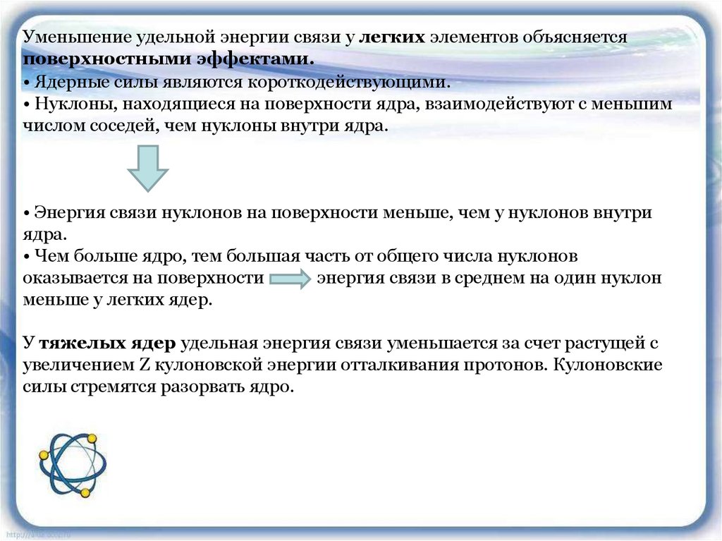 • Энергия связи нуклонов на поверхности меньше, чем у нуклонов внутри