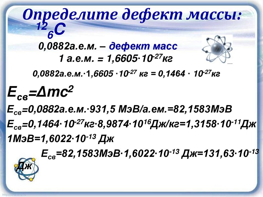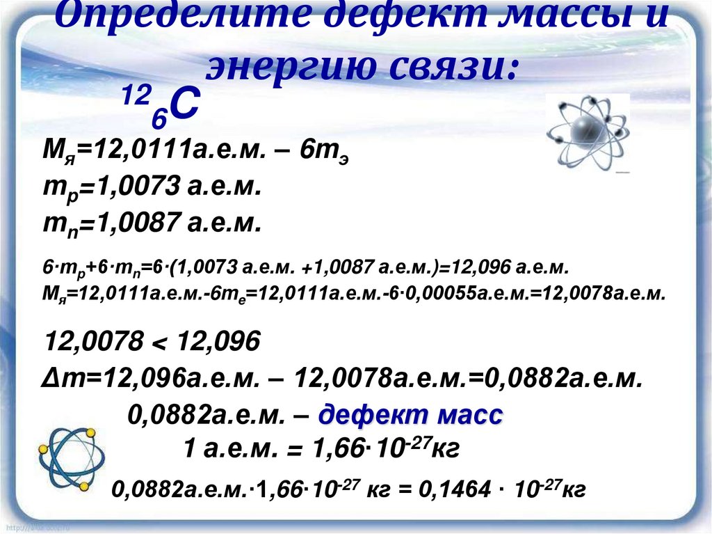 Δm=12,096а.е.м. – 12,0078а.е.м.=0,0882а.е.м.