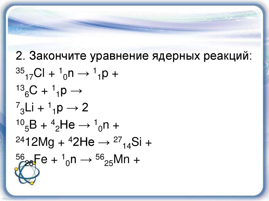 2. Закончите уравнение ядерных реакций:35 Cl + 1 n → 1 p +