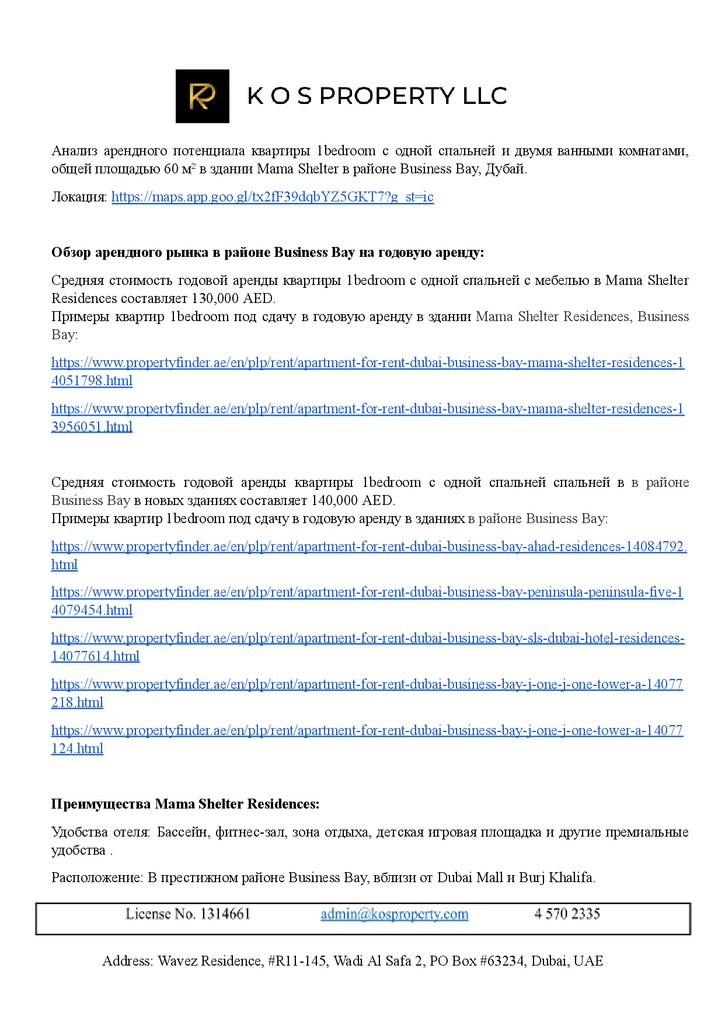 Анализ арендного потенциала квартиры 1bedroom с одной спальней и двумя ванными комнатами,общей площадью 60 м² в здании Mama Shelter в районе Business Bay, Дубай.