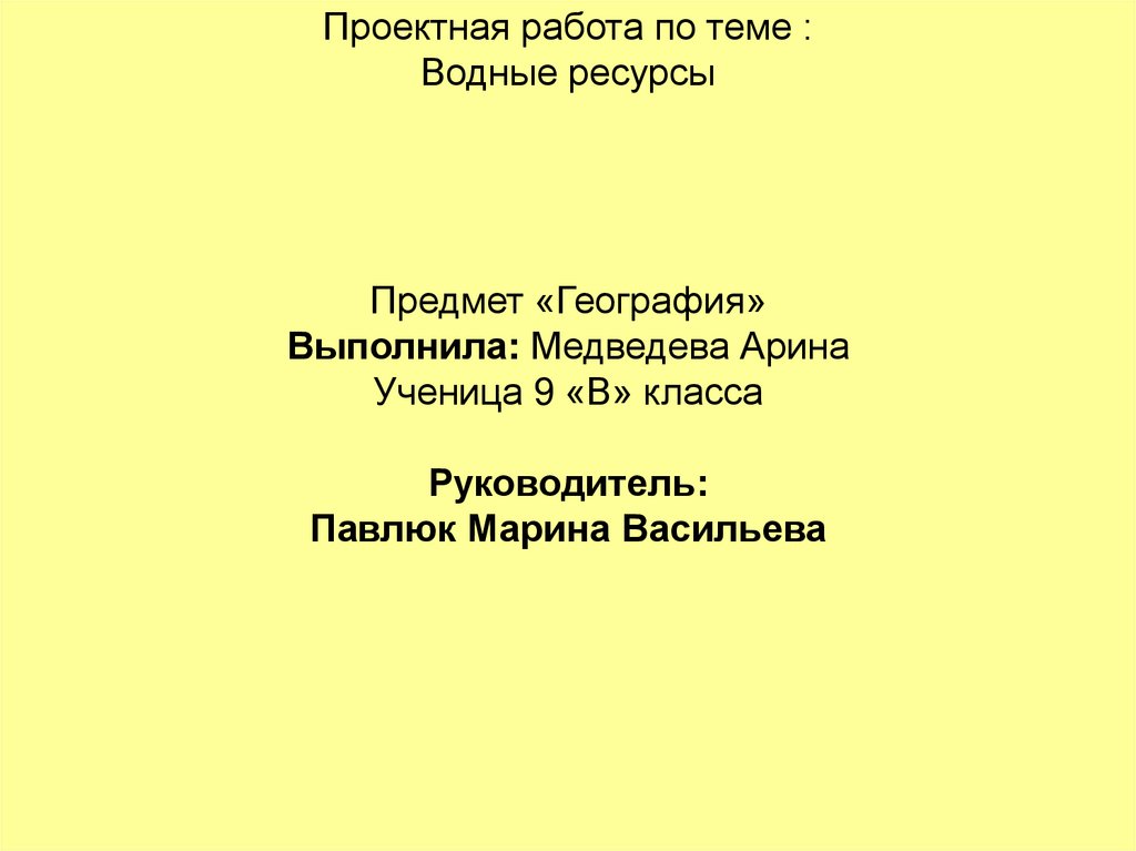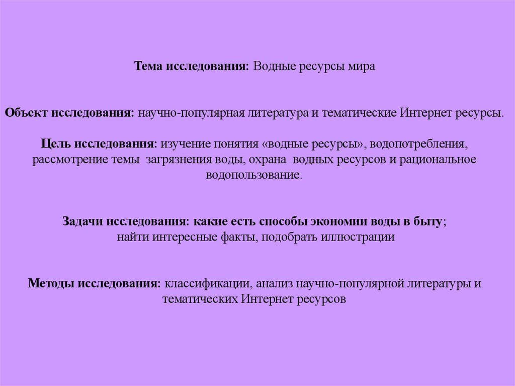 Тема исследования: Водные ресурсы мираОбъект исследования: научно-популярная литература и тематические Интернет ресурсы.