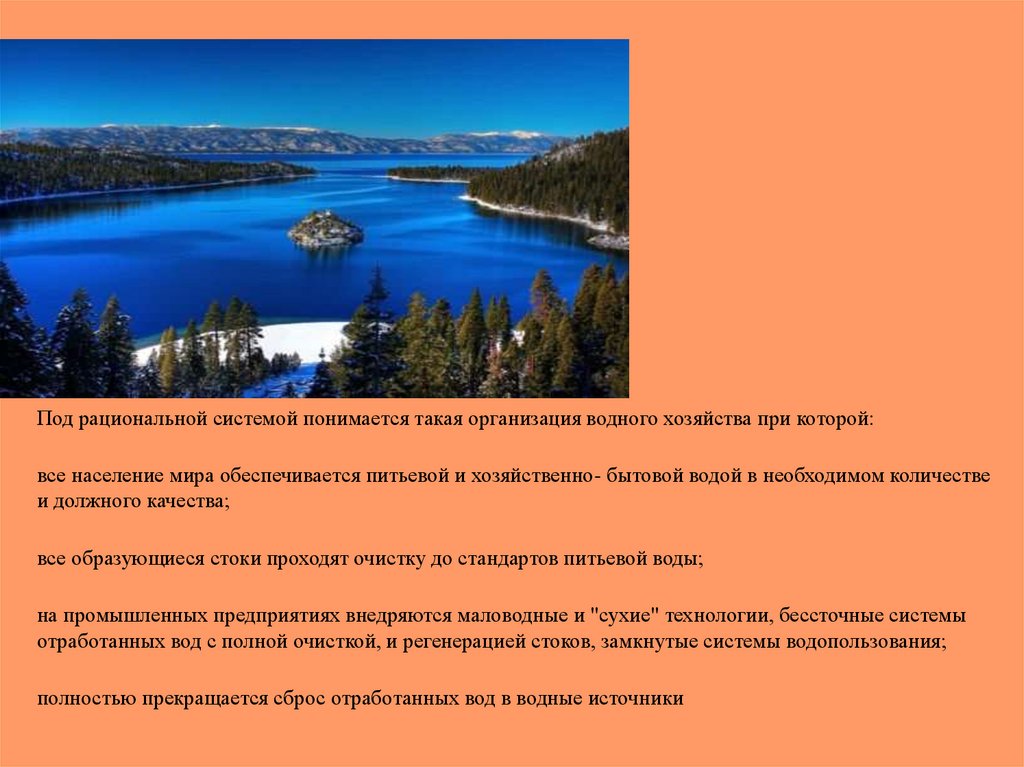 Под рациональной системой понимается такая организация водного хозяйства при которой:все население мира обеспечивается питьевой и хозяйственно- бытовой водой в необходимом количестве