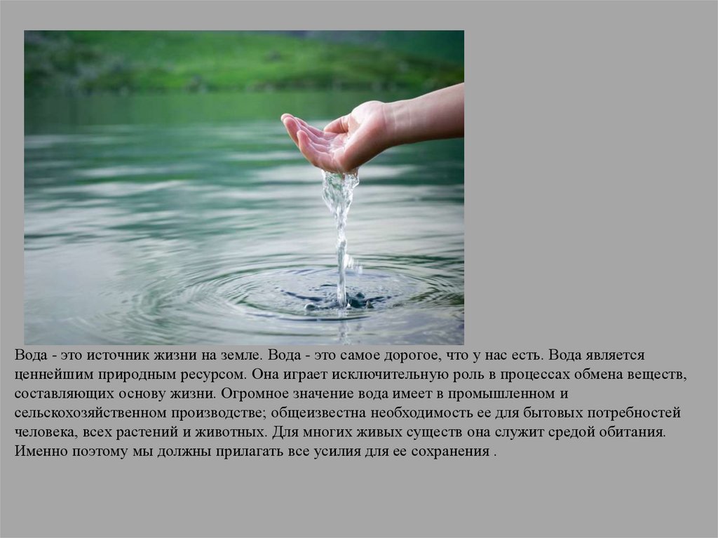 Вода - это источник жизни на земле. Вода - это самое дорогое, что у нас есть. Вода являетсяценнейшим природным ресурсом. Она играет исключительную роль в процессах обмена веществ,