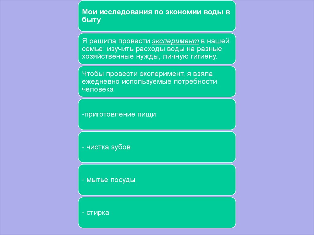 Мытье посудыЯ помыла посуду на три персоны под проточной водой. В результате было использовано 10