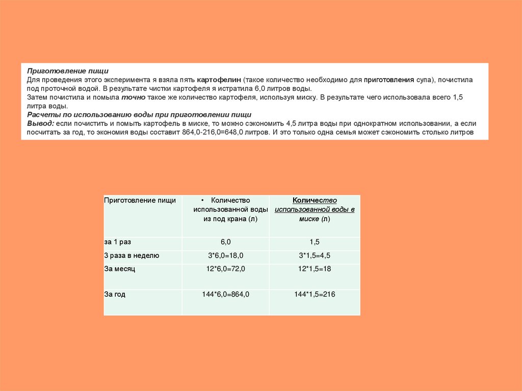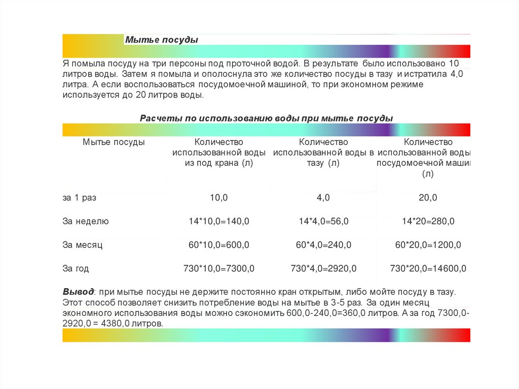 литров воды. Затем я помыла и ополоснула это же количество посуды в тазу и истратила 4,0
