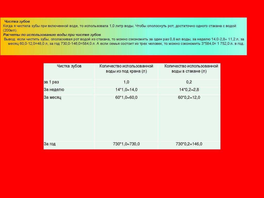 Чистка зубовКогда я чистила зубы при включенной воде, то использовала 1,0 литр воды. Чтобы ополоснуть рот, достаточно одного стакана с водой