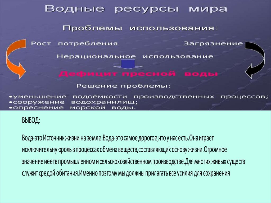 Цель исследования: изучение понятия «водные ресурсы», водопотребления,