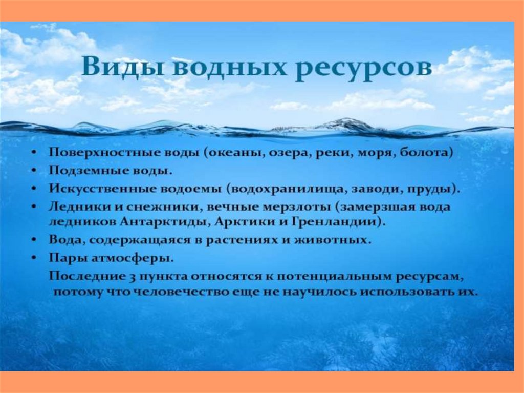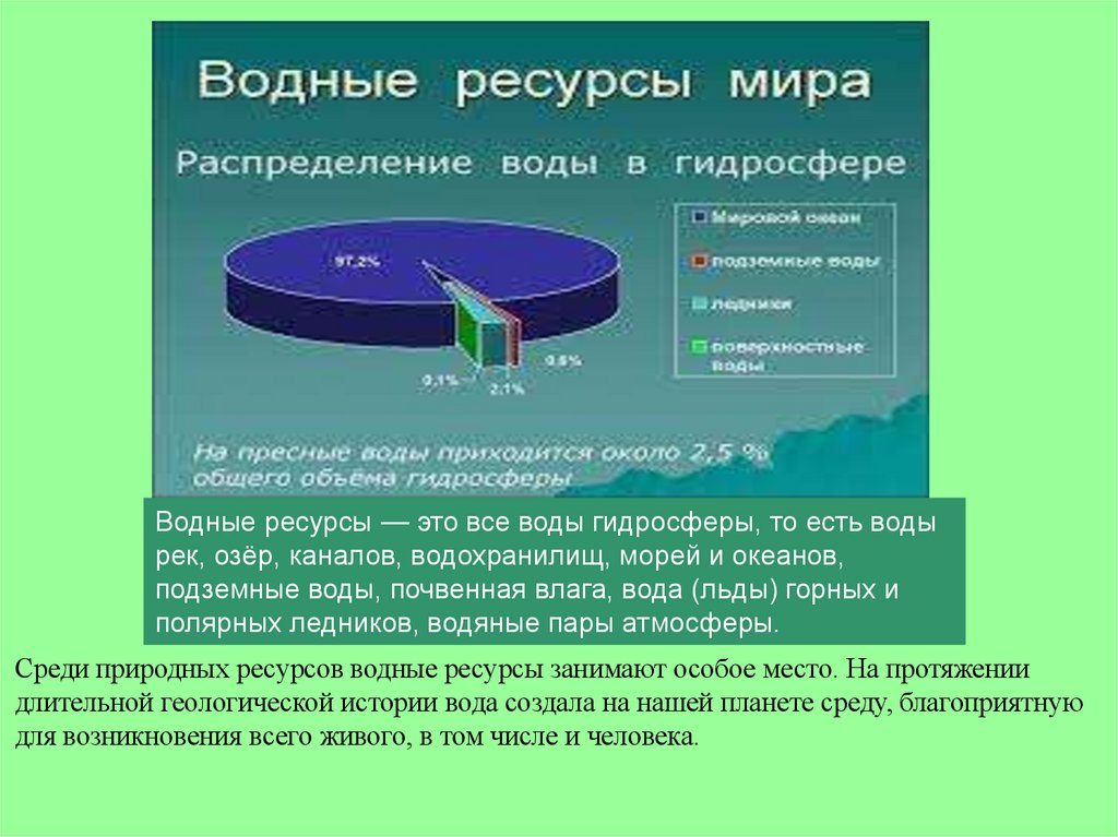 Водные ресурсы — это все воды гидросферы, то есть водырек, озёр, каналов, водохранилищ, морей и океанов,
