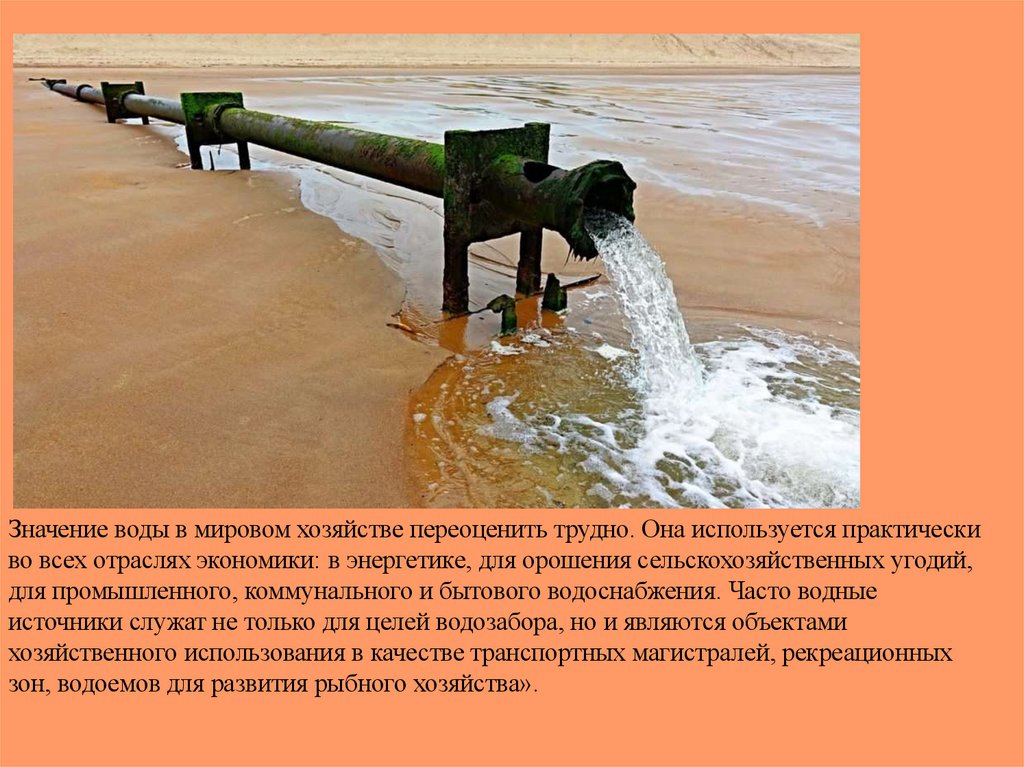 Значение воды в мировом хозяйстве переоценить трудно. Она используется практическиво всех отраслях экономики: в энергетике, для орошения сельскохозяйственных угодий,