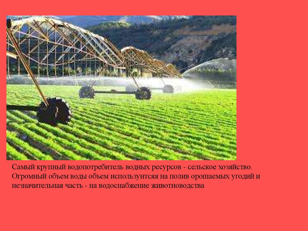 Самый крупный водопотребитель водных ресурсов - сельское хозяйство.Огромный объем воды объем использунтсяя на полив орошаемых угодий и