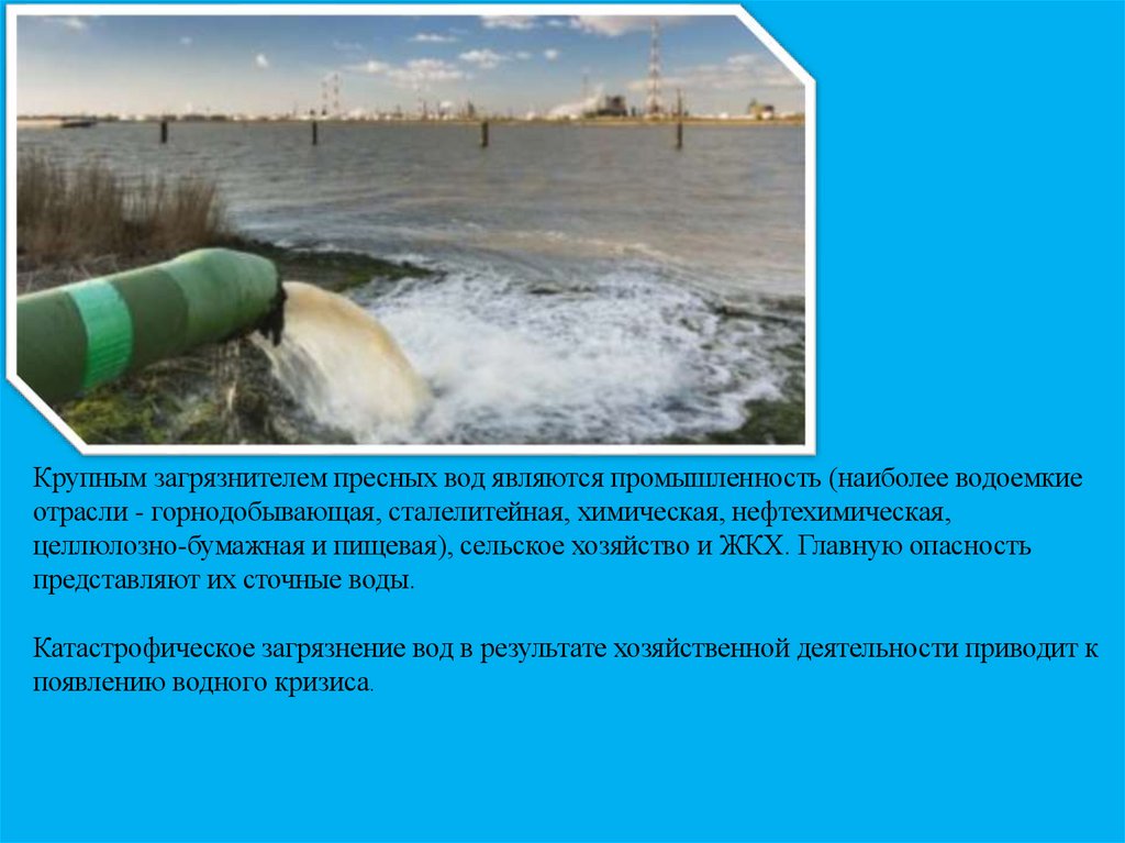 Крупным загрязнителем пресных вод являются промышленность (наиболее водоемкиеотрасли - горнодобывающая, сталелитейная, химическая, нефтехимическая,
