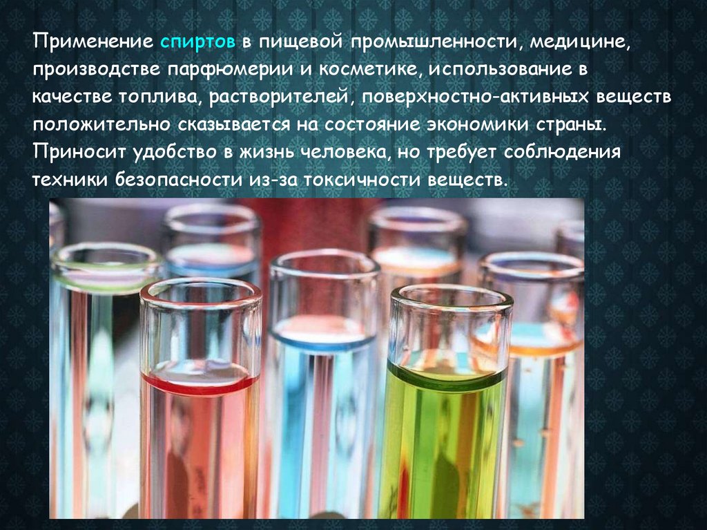 Применение спиртов в пищевой промышленности, медицине,производстве парфюмерии и косметике, использование в