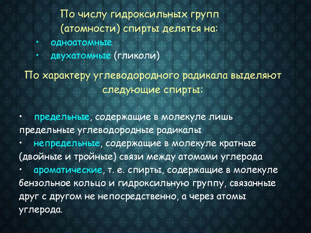 По числу гидроксильных групп(атомности) спирты делятся на: