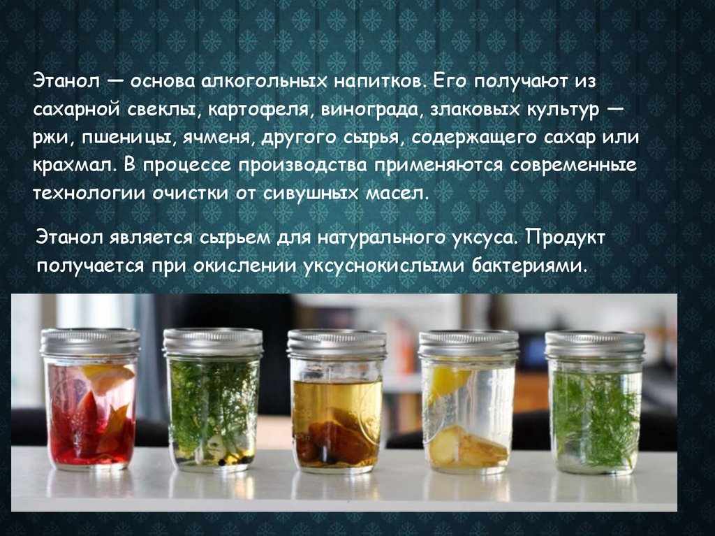 Этанол — основа алкогольных напитков. Его получают изсахарной свеклы, картофеля, винограда, злаковых культур —