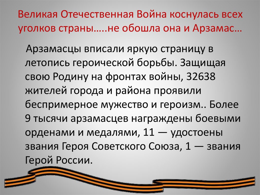 1. Великая Отечественная Война коснулась всех уголков страны…..не обошла она и Арзамас…