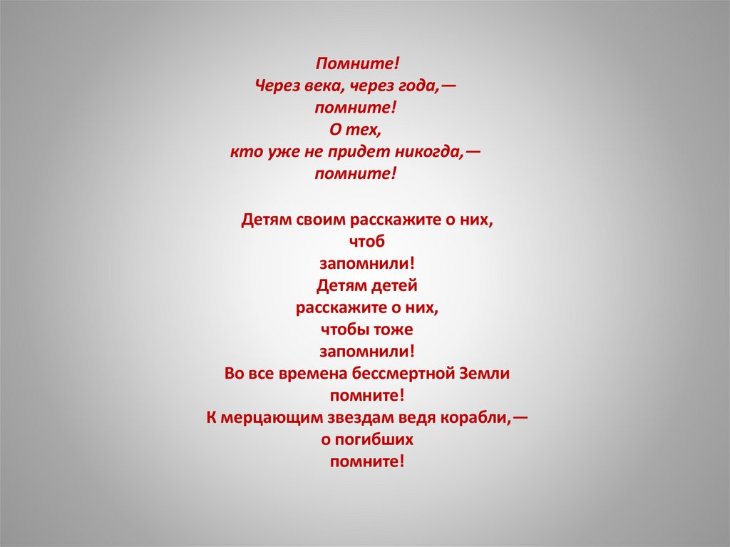 3. Люди! Покуда сердца стучатся,— помните! Какою ценой завоевано счастье,— пожалуйста, помните!