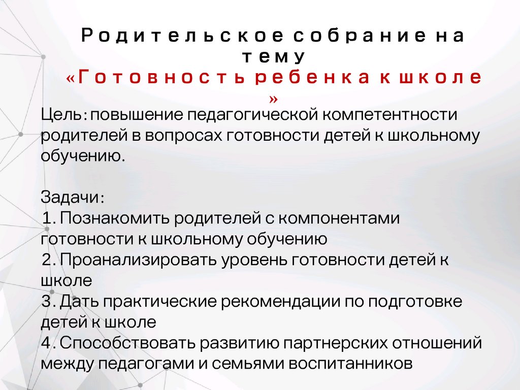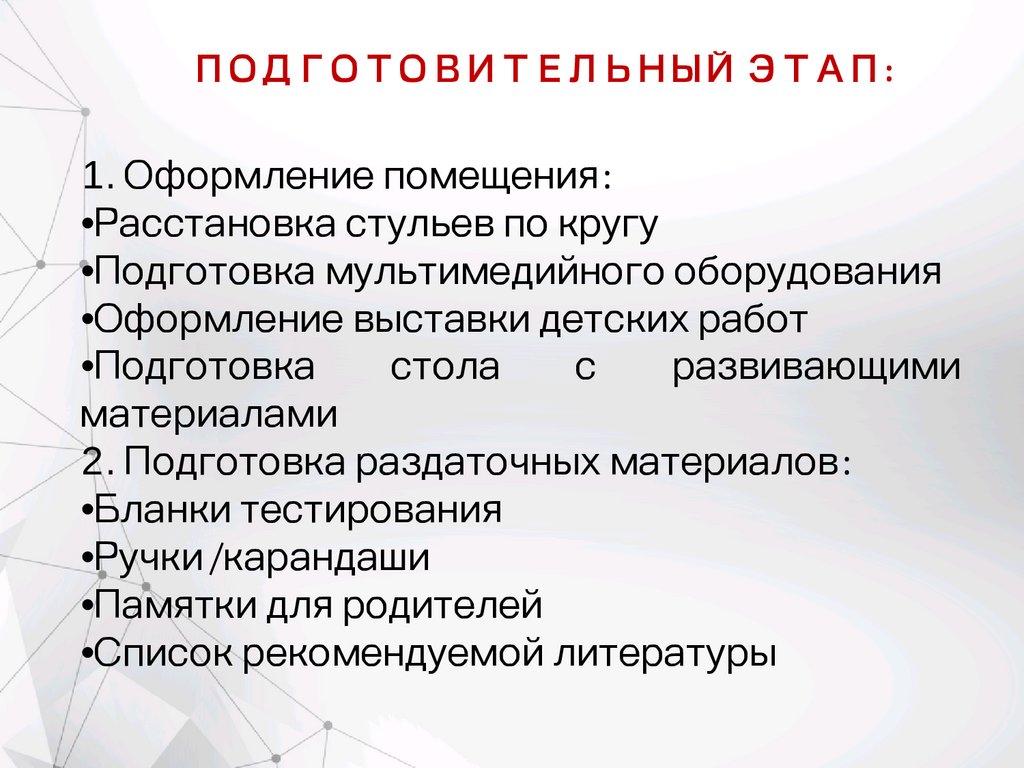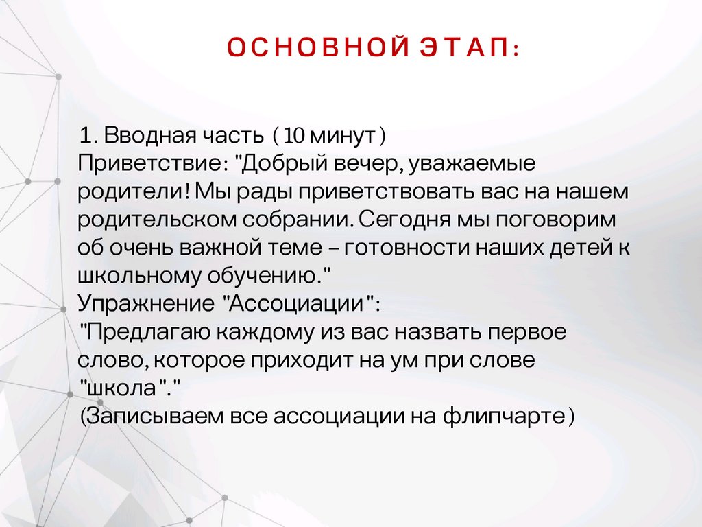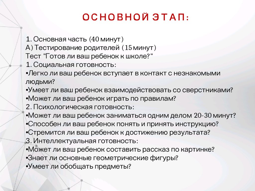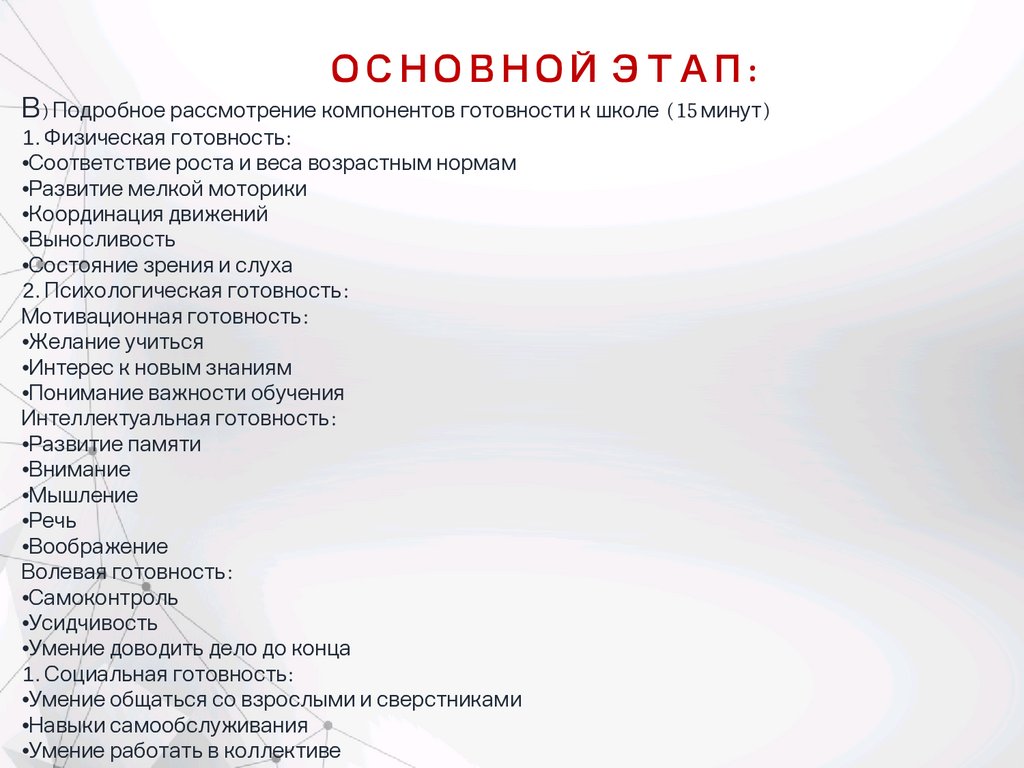 ОСНОВНОЙ ЭТАП:В) Подробное рассмотрение компонентов готовности к школе (15 минут)