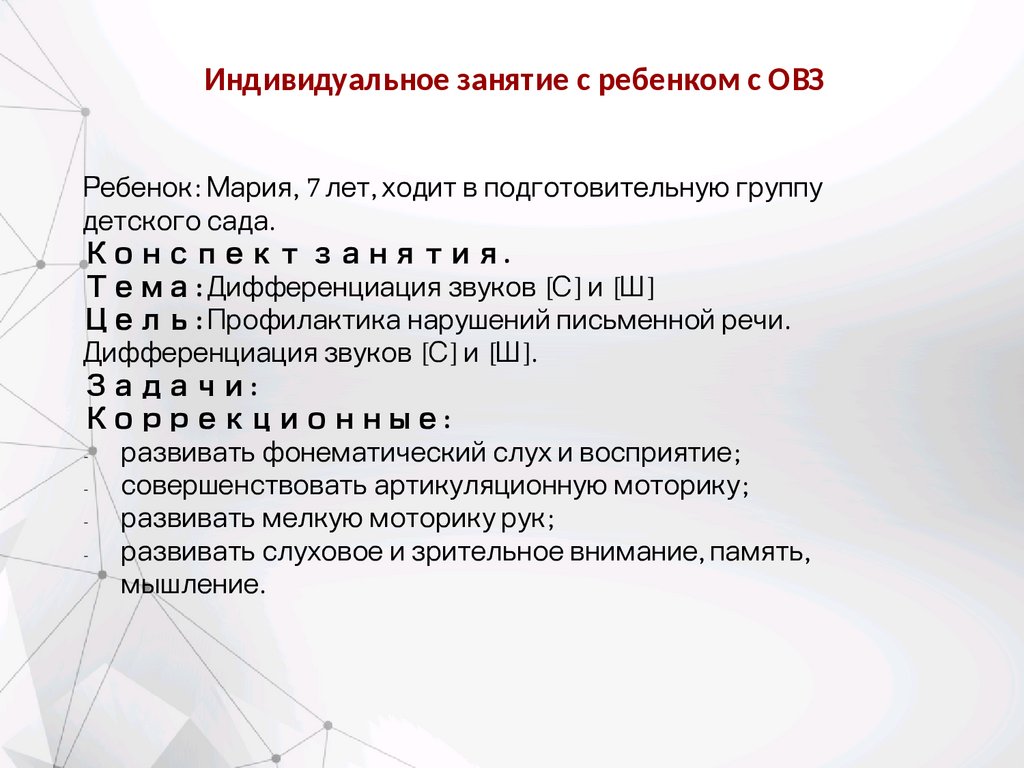 Индивидуальное занятие с ребенком с ОВЗРебенок: Мария, 7 лет, ходит в подготовительную группу