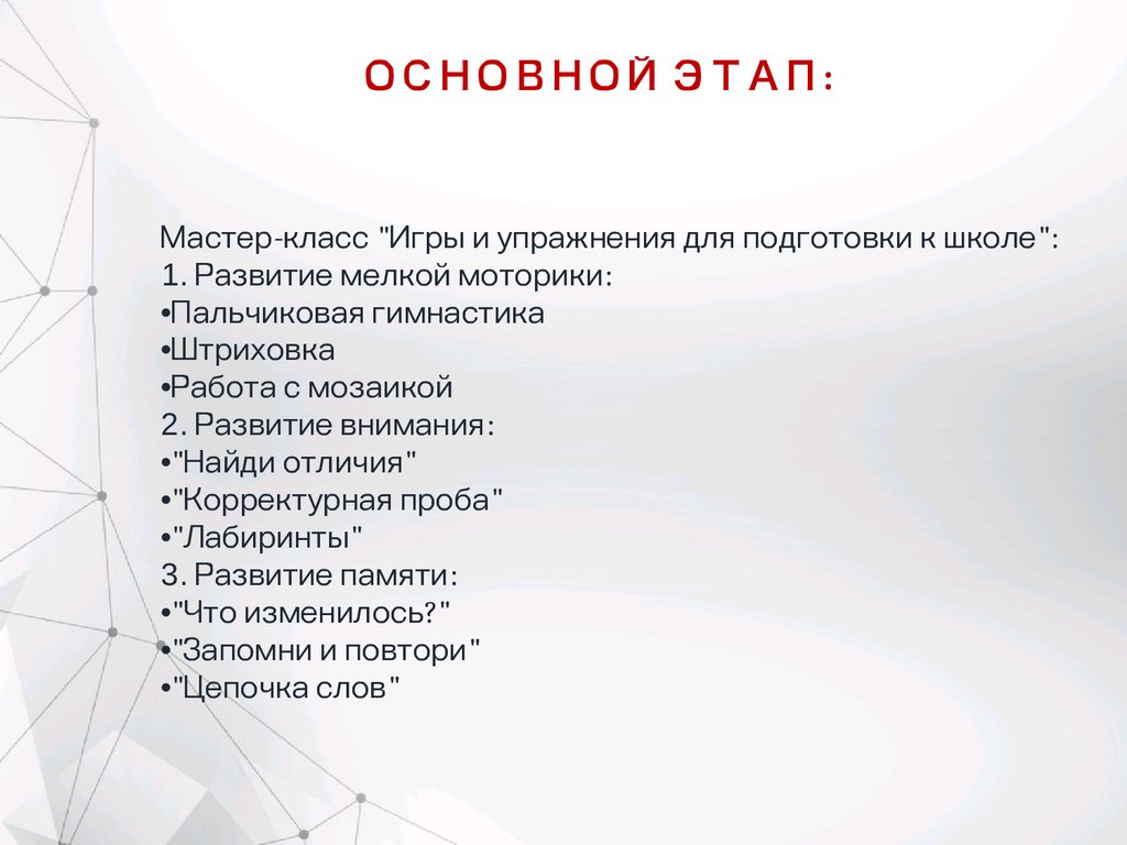 ОСНОВНОЙ ЭТАП:Мастер-класс "Игры и упражнения для подготовки к школе":