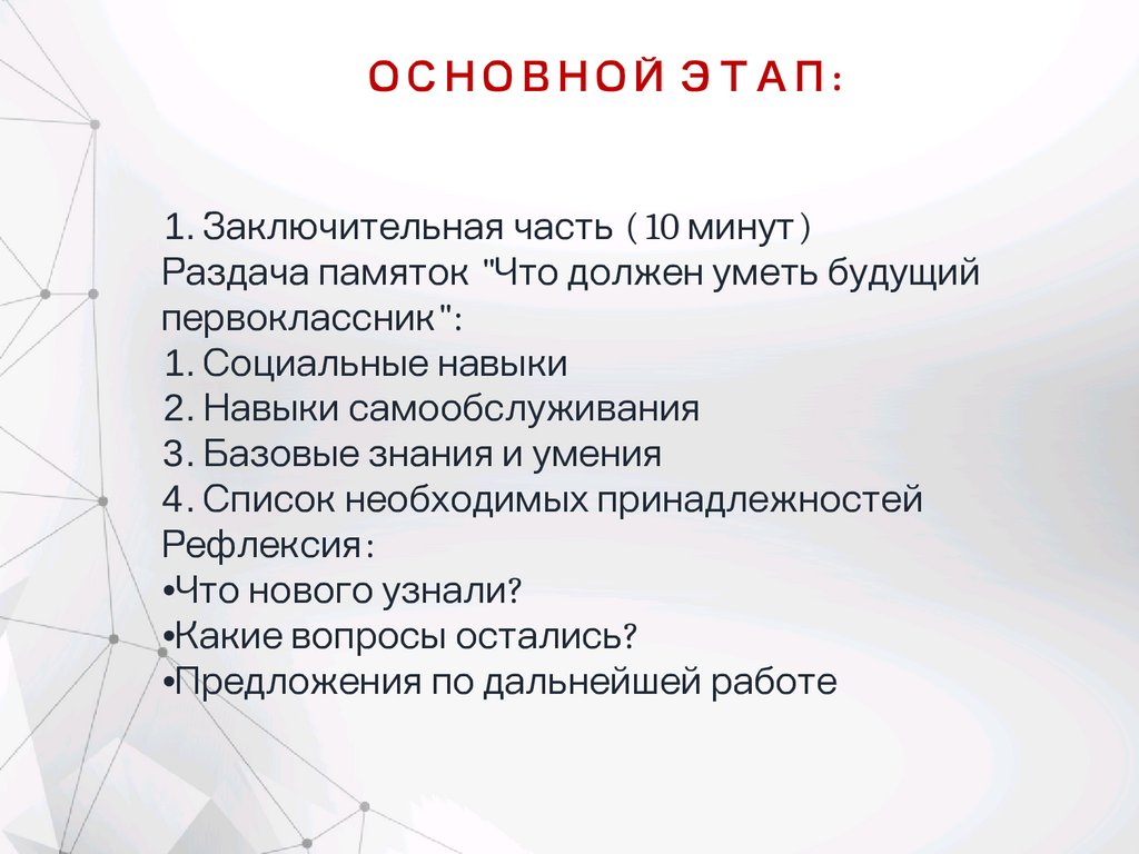 ОСНОВНОЙ ЭТАП:1. Заключительная часть (10 минут)