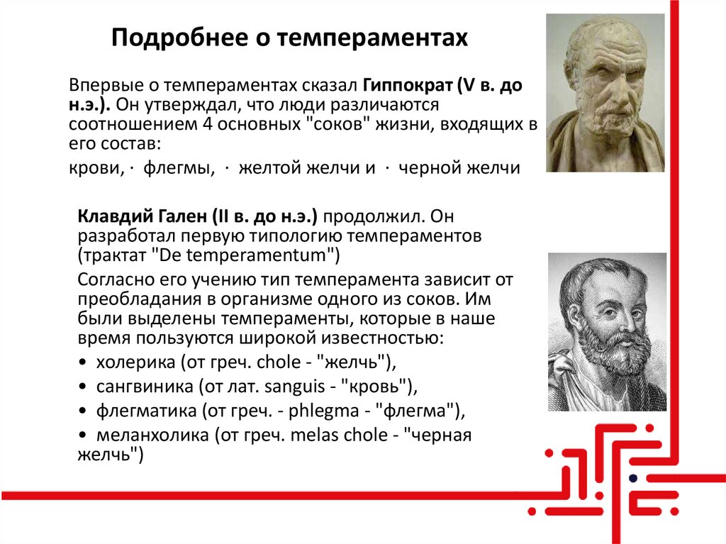 Впервые о темпераментах сказал Гиппократ (V в. дон.э.). Он утверждал, что люди различаются