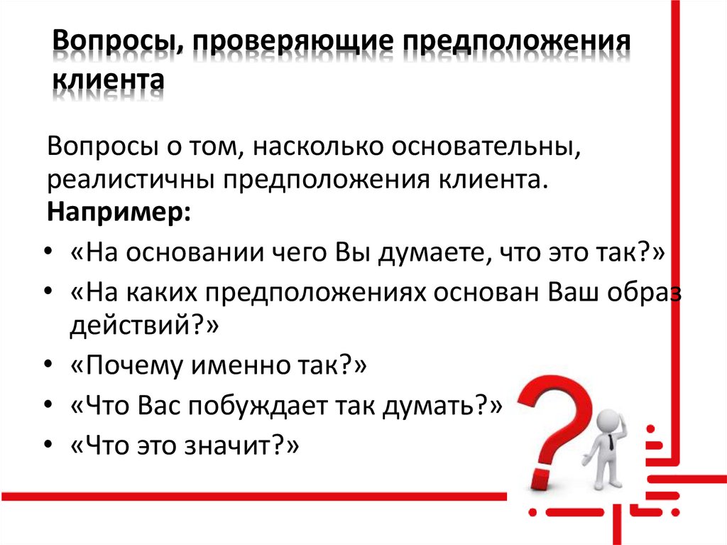 Вопросы о том, насколько основательны,реалистичны предположения клиента.