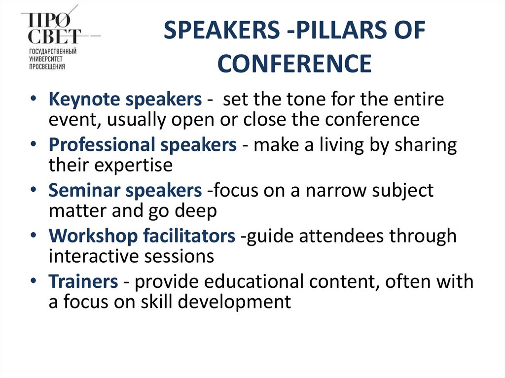 • Keynote speakers - set the tone for the entireevent, usually open or close the conference