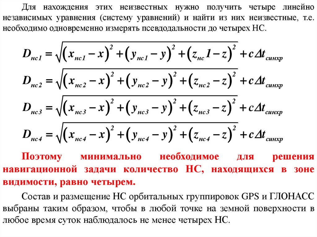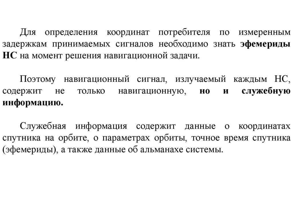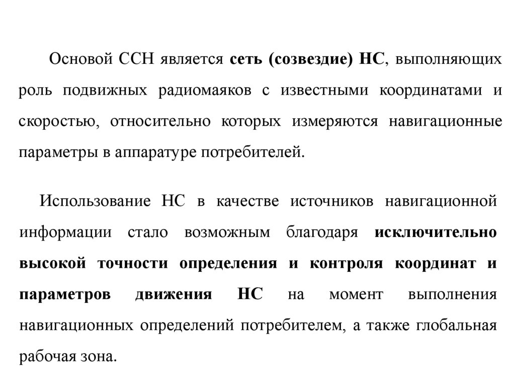 Основой ССН является сеть (созвездие) НС, выполняющихроль подвижных радиомаяков с известными координатами и