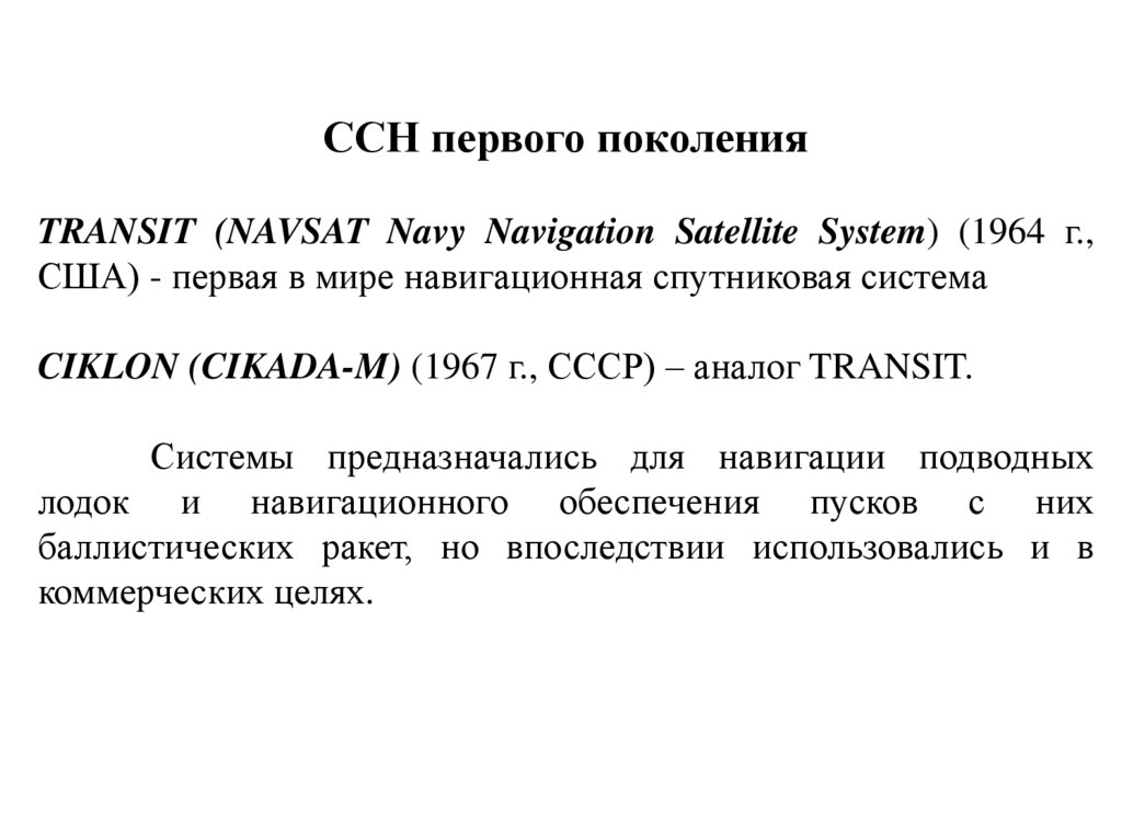 ССН первого поколенияTRANSIT (NAVSAT Navy Navigation Satellite System) (1964 г.,