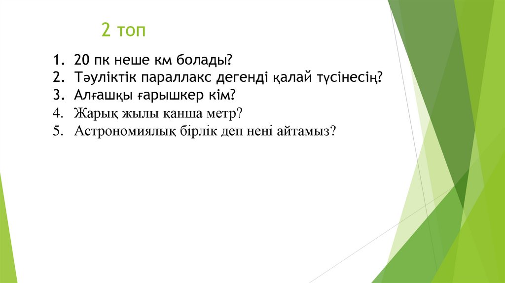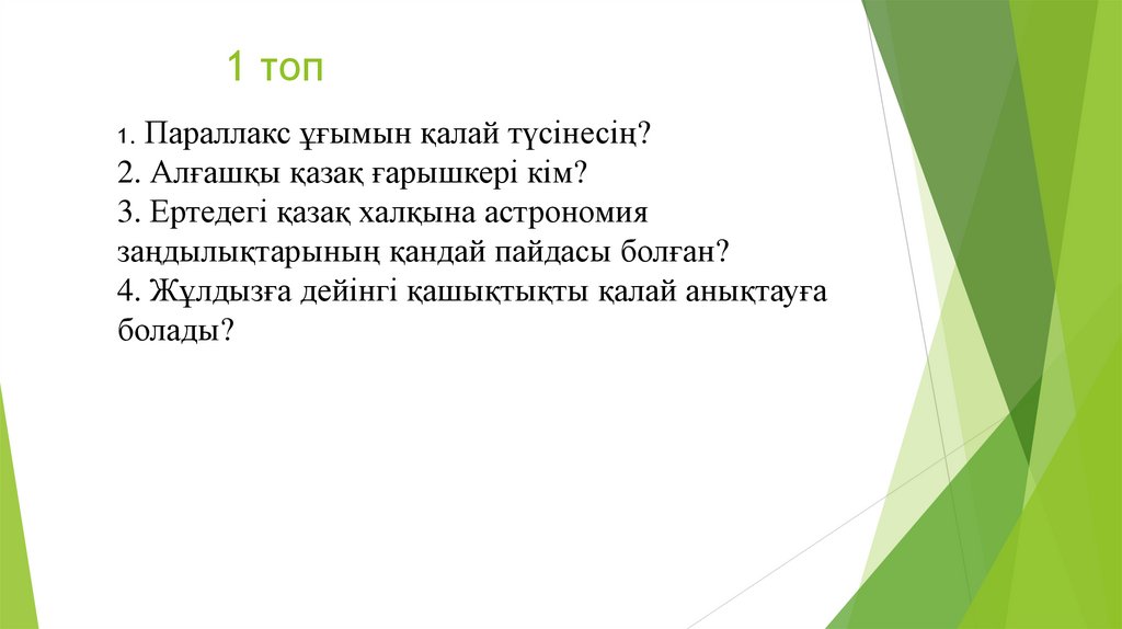 1. Параллакс ұғымын қалай түсінесің?2. Алғашқы қазақ ғарышкері кім?