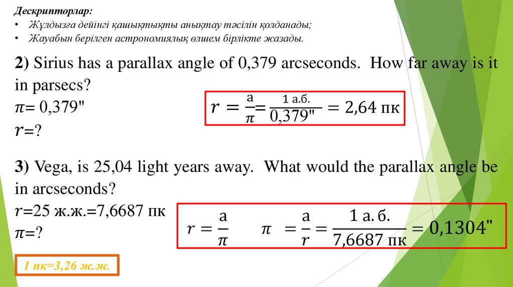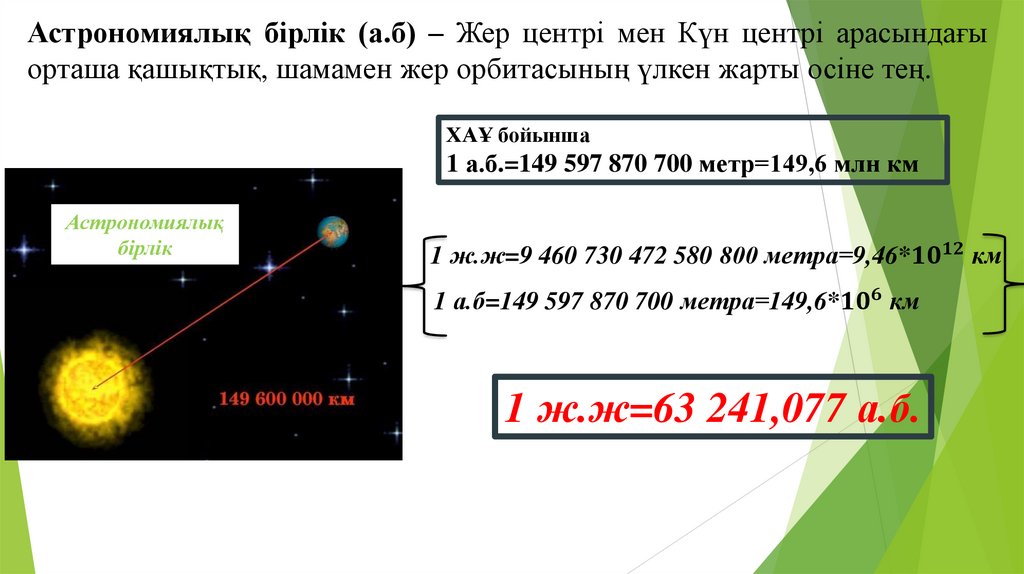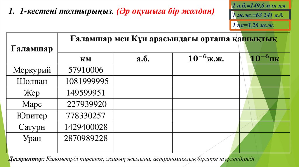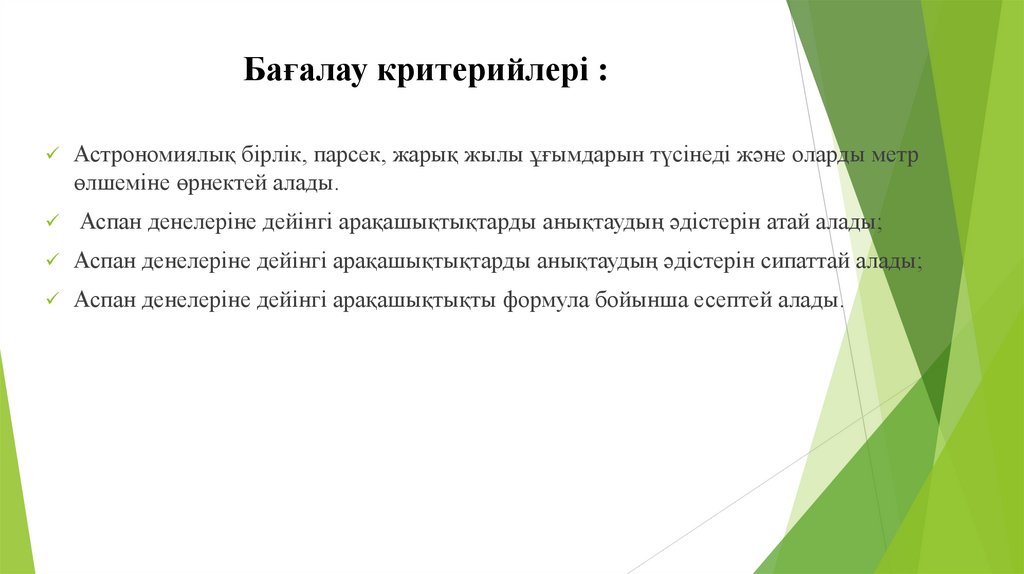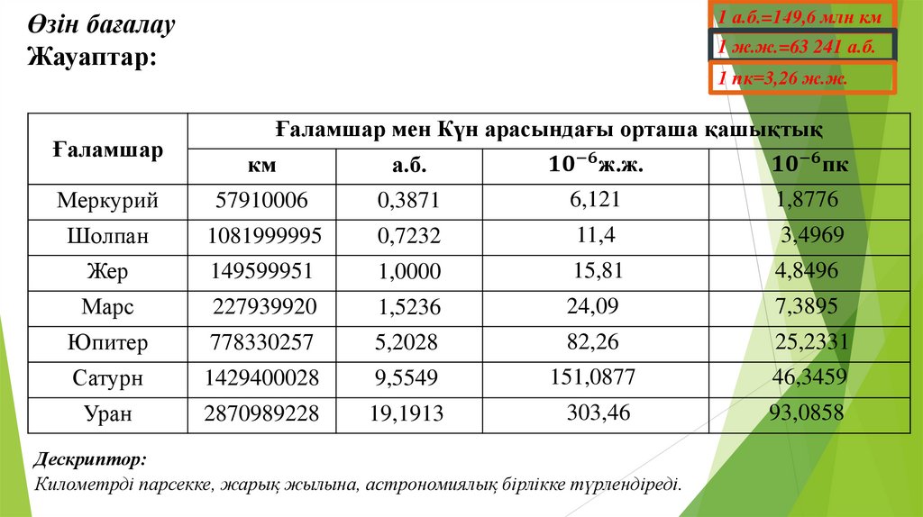 Бағалау критерийлері :Астрономиялық бірлік, парсек, жарық жылы ұғымдарын түсінеді және оларды метр