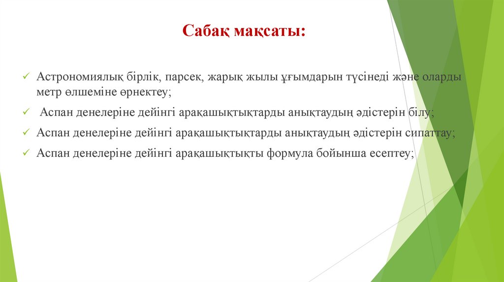 Сабақ мақсаты:Астрономиялық бірлік, парсек, жарық жылы ұғымдарын түсінеді және оларды