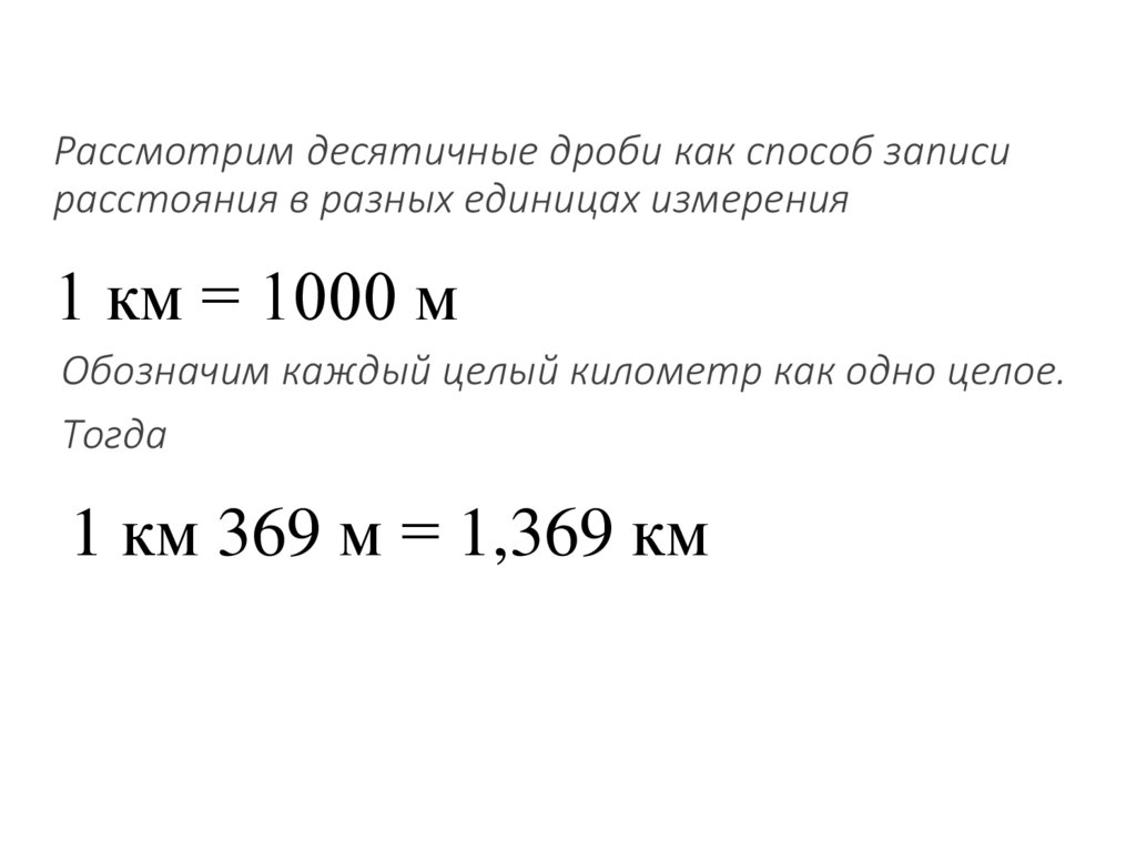 Рассмотрим десятичные дроби как способ записирасстояния в разных единицах измерения