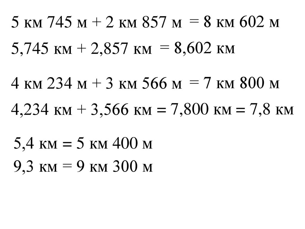 5 км 745 м + 2 км 857 м = 8 км 602 м5,745 км + 2,857 км = 8,602 км