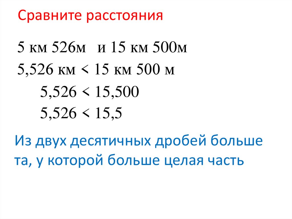 Сравните расстояния5 км 526м и 15 км 500м