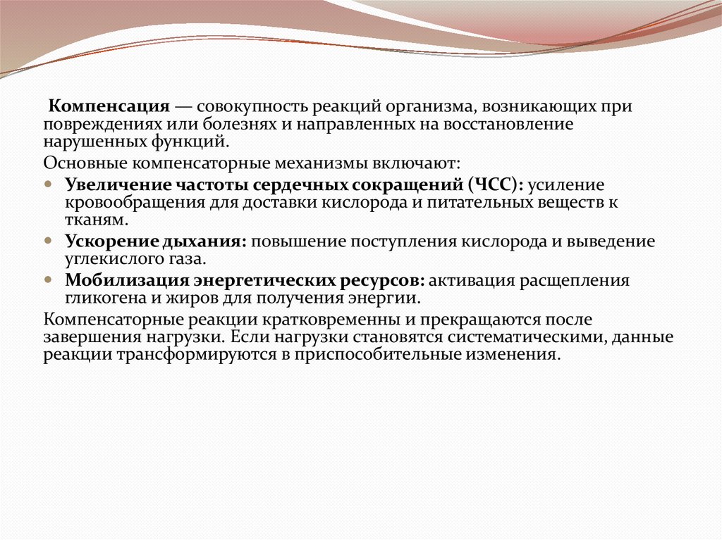Компенсация — совокупность реакций организма, возникающих приповреждениях или болезнях и направленных на восстановление