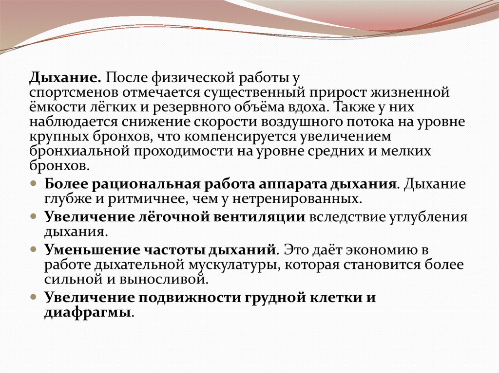 Дыхание. После физической работы успортсменов отмечается существенный прирост жизненной