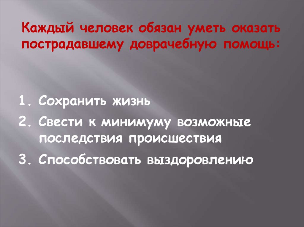 Каждый человек обязан уметь оказатьпострадавшему доврачебную помощь:
