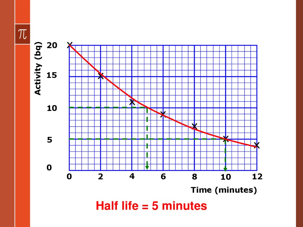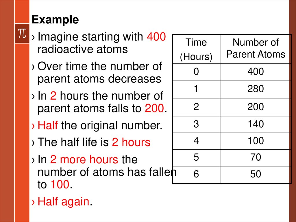 › The half life is the time taken for the number ofparent atoms in a radioactive sample to halve.