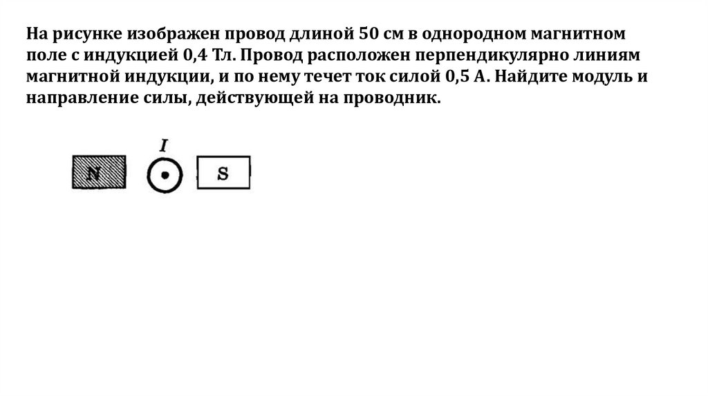 На рисунке изображен провод длиной 50 см в однородном магнитномполе с индукцией 0,4 Тл. Провод расположен перпендикулярно линиям