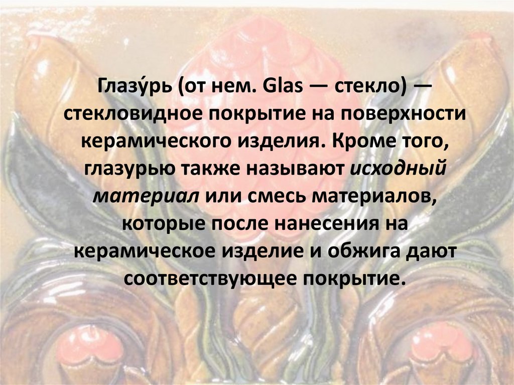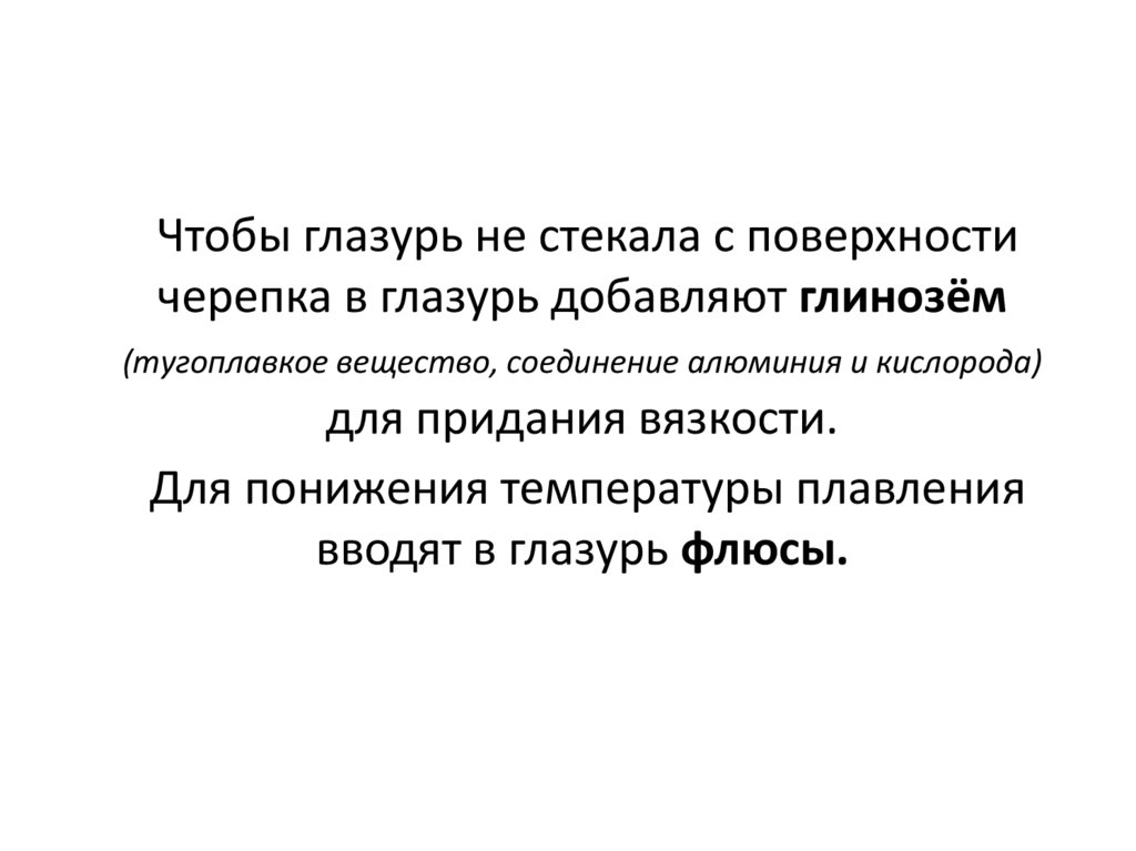 Чтобы глазурь не стекала с поверхностичерепка в глазурь добавляют глинозём