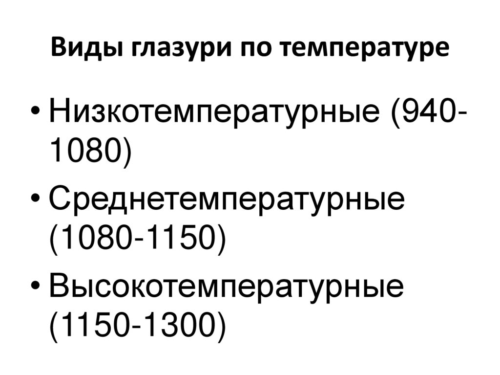 Виды глазури по температуре• Низкотемпературные (9401080)