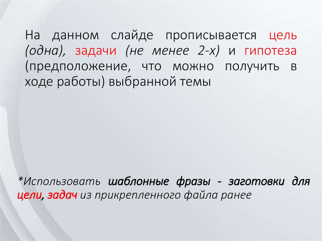 На данном слайде прописывается цель(одна), задачи (не менее 2-х) и гипотеза