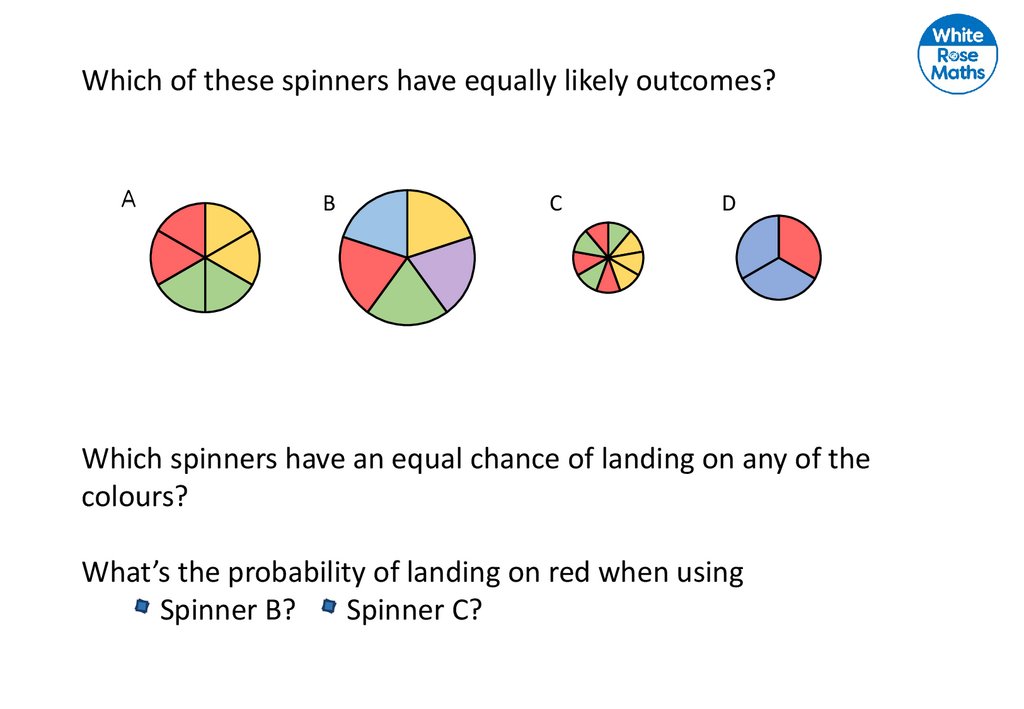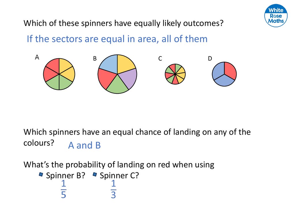 Which of these spinners have equally likely outcomes?If the sectors are equal in area, all of them