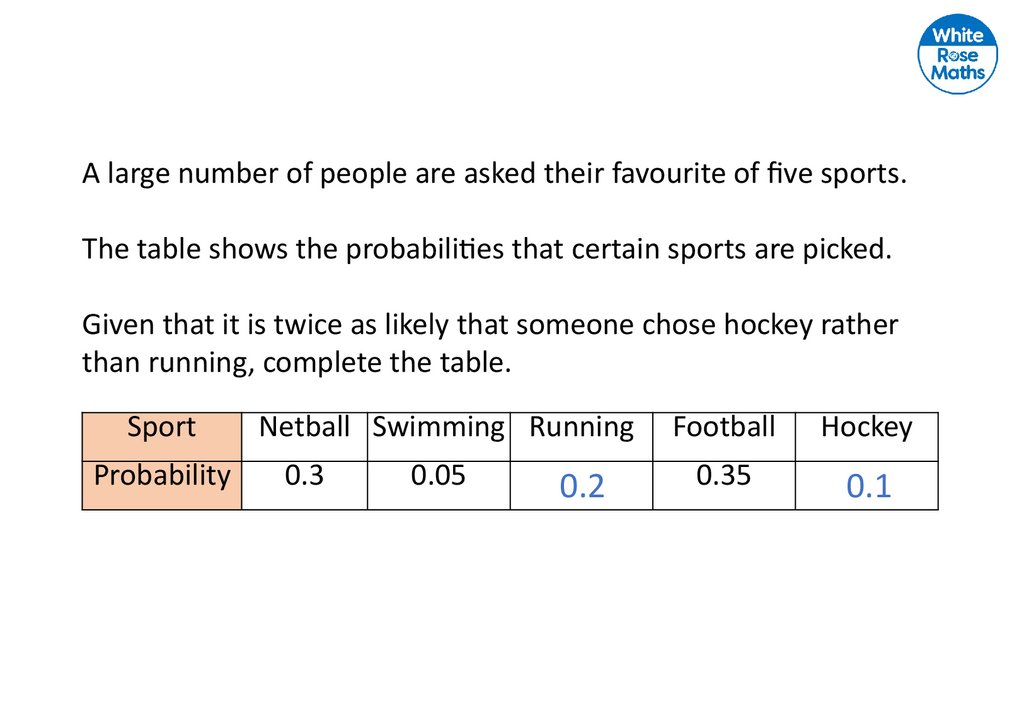 A large number of people are asked their favourite of five sports.The table shows the probabilities that certain sports are picked.