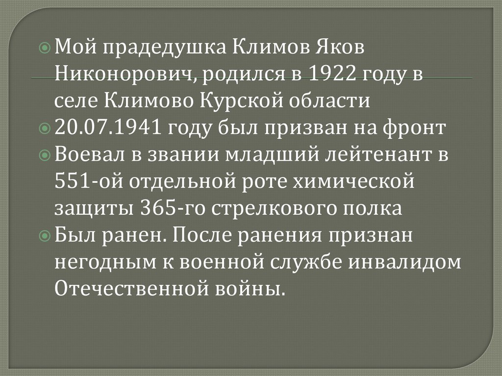 Мой прадедушка Климов ЯковНиконорович, родился в 1922 году в