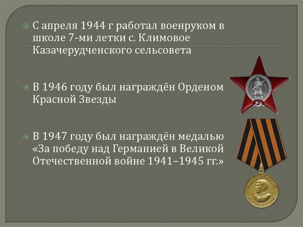 С апреля 1944 г работал военруком вшколе 7-ми летки с. Климовое