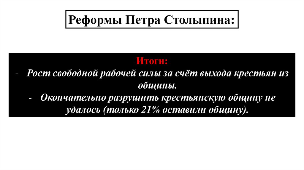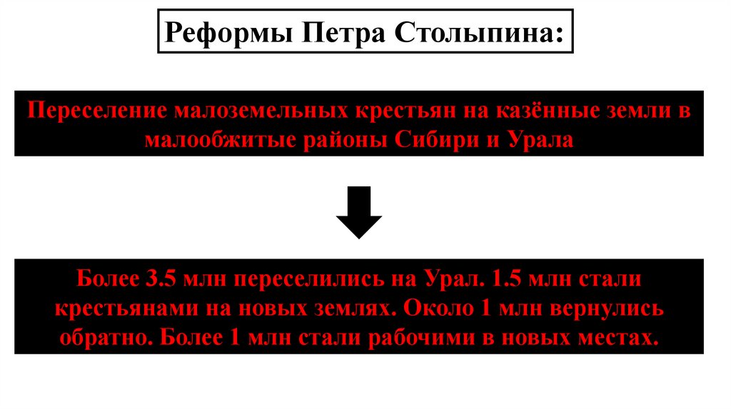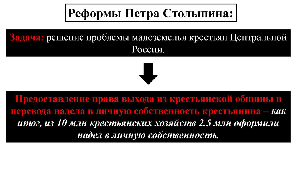 Реформы Петра Столыпина:Задача: решение проблемы малоземелья крестьян Центральной