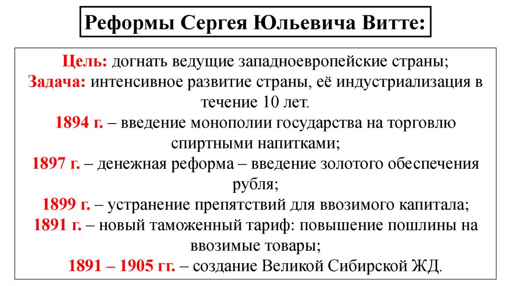 Реформы Сергея Юльевича Витте:Цель: догнать ведущие западноевропейские страны;
