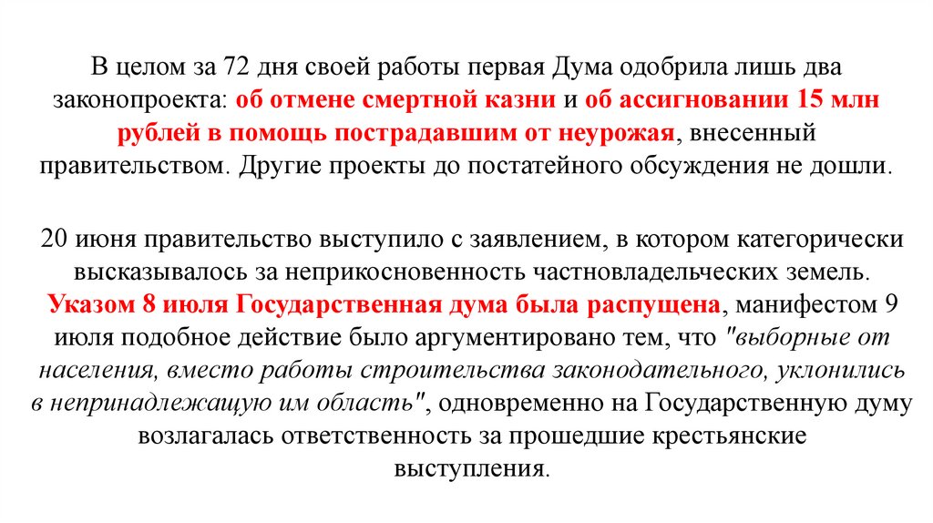 В целом за 72 дня своей работы первая Дума одобрила лишь двазаконопроекта: об отмене смертной казни и об ассигновании 15 млн